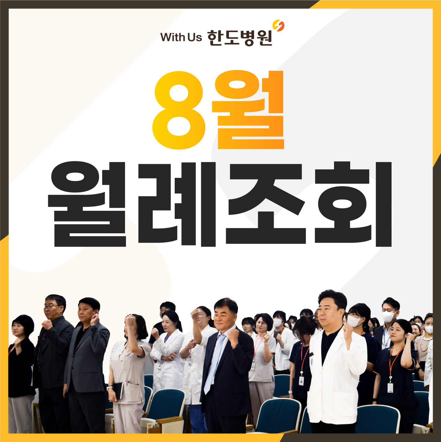2025년 8월 한도병원 월례조회 뜨거운 햇살이 이어지는 여름,한도병원에서는 8월의 시작을 알리는 월례조회가별관 시청각실에서 진행되었습니다.무더위 속에서도 직원 모두가 함께 모여,새로운 인연을 환영하고 ...