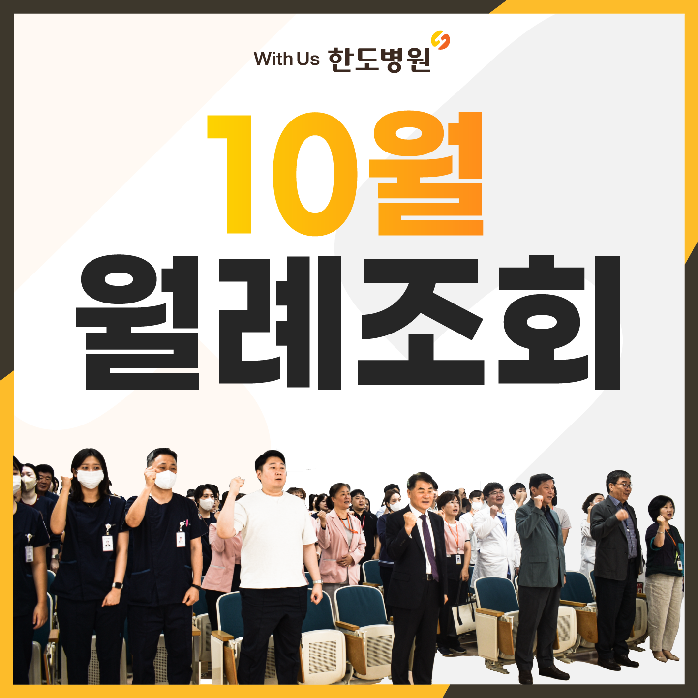 - 11월 월례조회 실시 안내 -안녕하세요.한도병원입니다.청명한 가을 하늘 아래, 어느덧 11월을 맞이하며전 직원이 함께한 11월 월례조회가 진행되었습니다.이번 월례조회에서는지난 10월 새롭게 한도병원 가족이...
