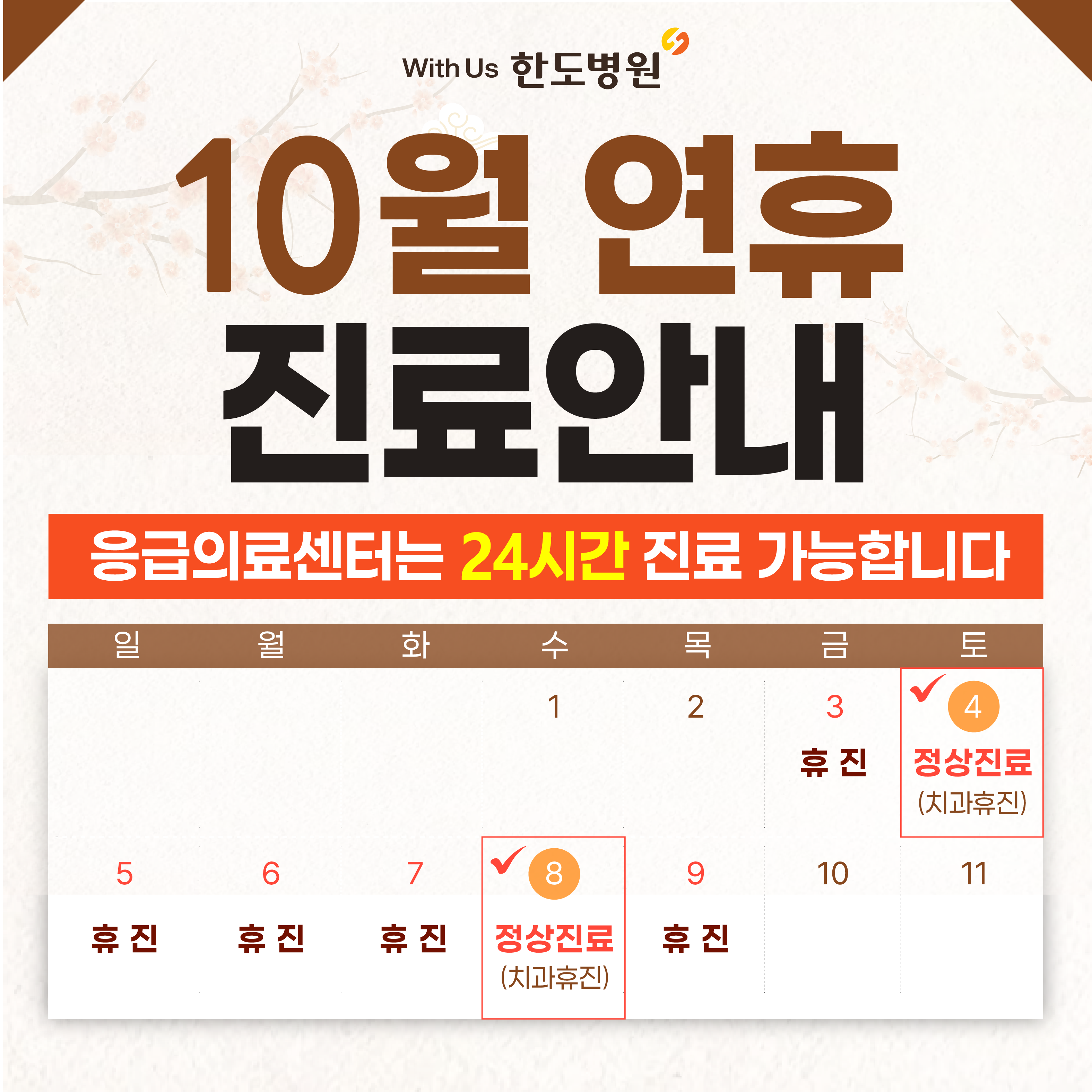 ※ 진료안내 ※ 안녕하세요 한도병원 입니다. 10월 4일(토) 정상진료10월 8일(수) 정상진료 (치과휴진)진료일정 확인하셔서 병원 내원 및 예약 시불편함 없으시길 바랍니다