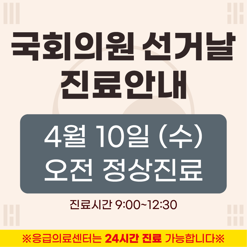 '4월 10일 (수) 국회의원 선거날' 오전 정상진료입니다.